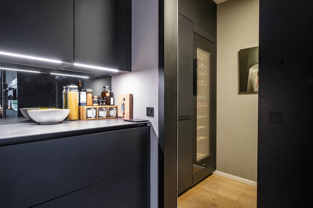 angrenzend praktischer Vorratsraum mit extra großem Kühlschrank und Weintemperierschrank runden die hohe