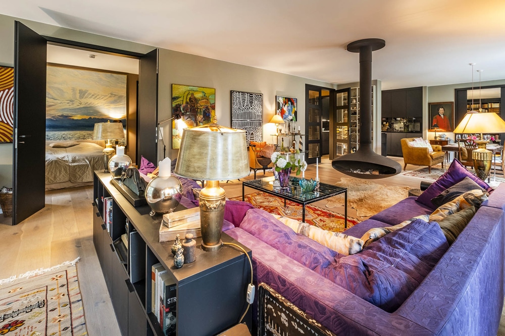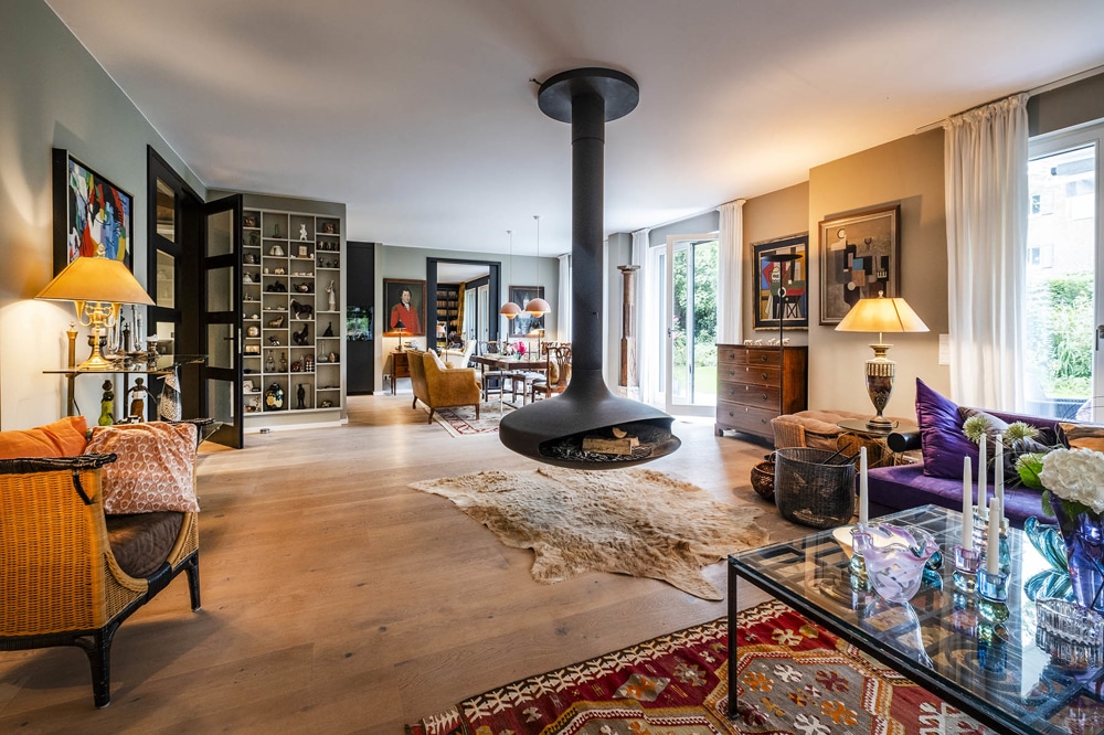 Das Herzstück der Wohnung bildet der offene ca. 60 qm große Wohnbereich mit dem freihängenden Kamin als echter