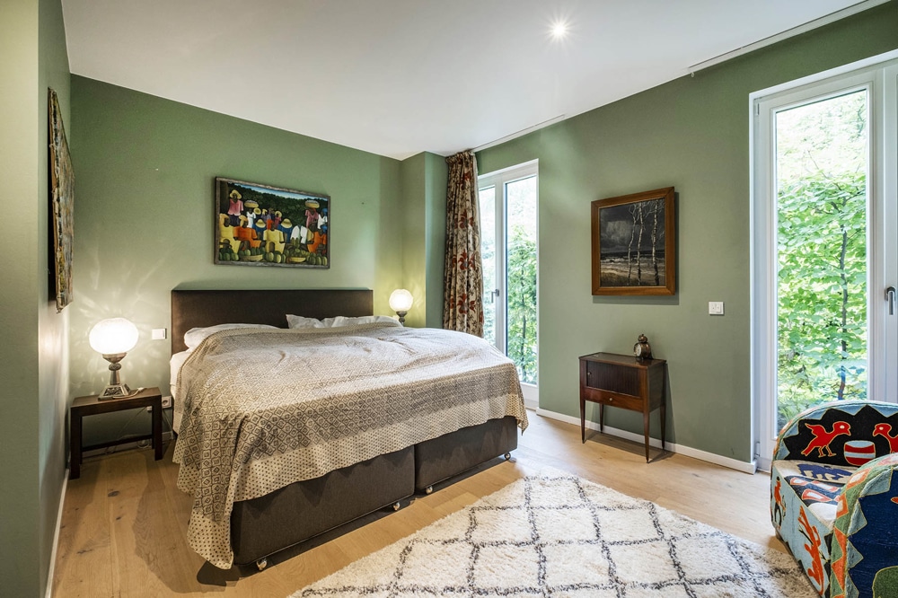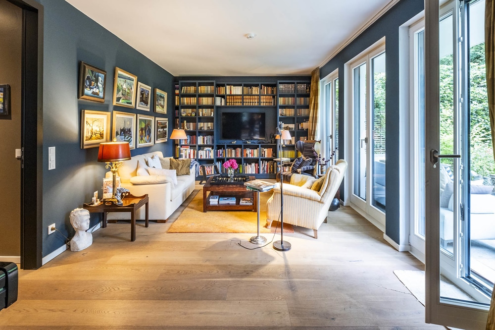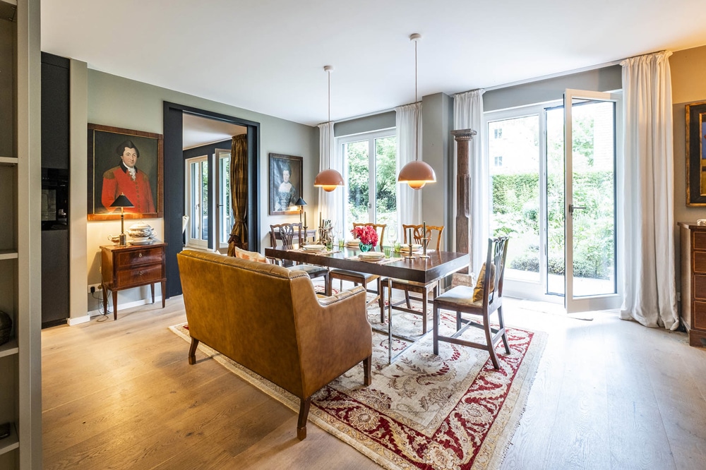 Die moderne und stilvoll eingerichtete Wohnung verfügt in allen Räumen über bodentiefe Fenster, die die großzügigen