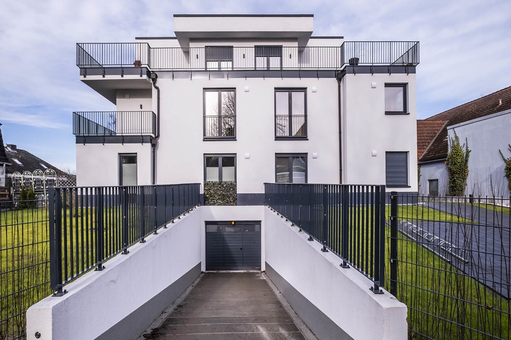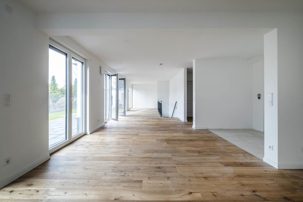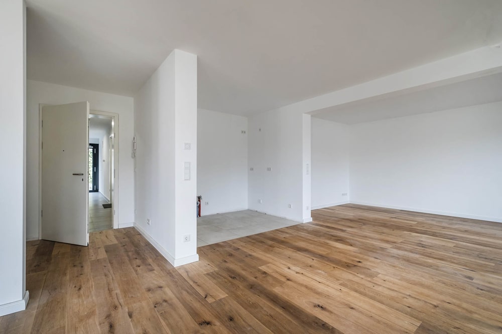 Helle Farben, Vollholzparkett und unaufdringliche Eleganz prägen das innere und äußere Erscheinungsbild des Gebäudes. Das Herz der Wohnung bildet zweifelsfrei der sonnige, gegliederte und offene Wohn-Essbereich mit zahlreichen bodentiefen Fenstern (und einer Fläche von ca. 58,34 qm). Vom Entree der Wohnung mit ca. 4,33 qm geht ein Hauswirtschaftsraum ab, das Badezimmer liegt hier auch. Die für die Küche vorgesehene Fläche beträgt ca. 6,32 qm.