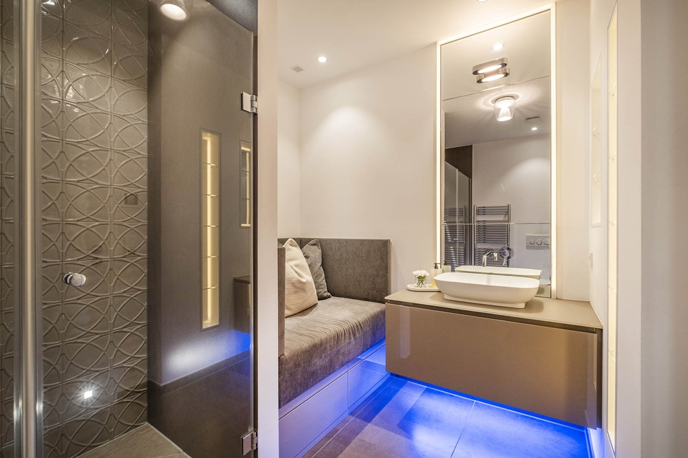 Raumtiefe schafft. Das hochwertig ausgestattete Bad ist bewusst separat angelegt, um Privatsphäre und klare
