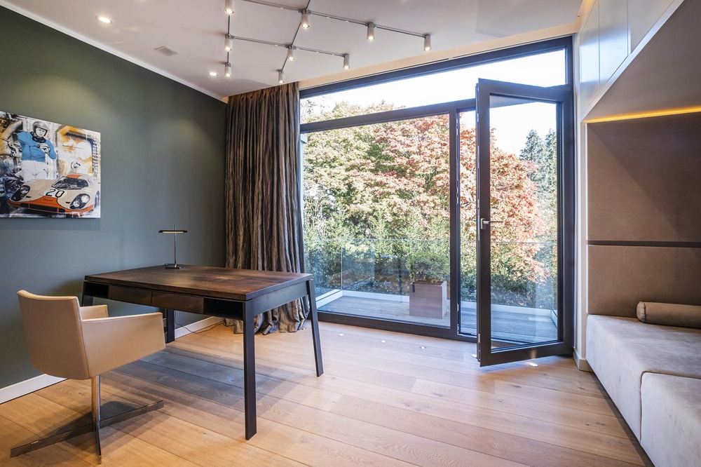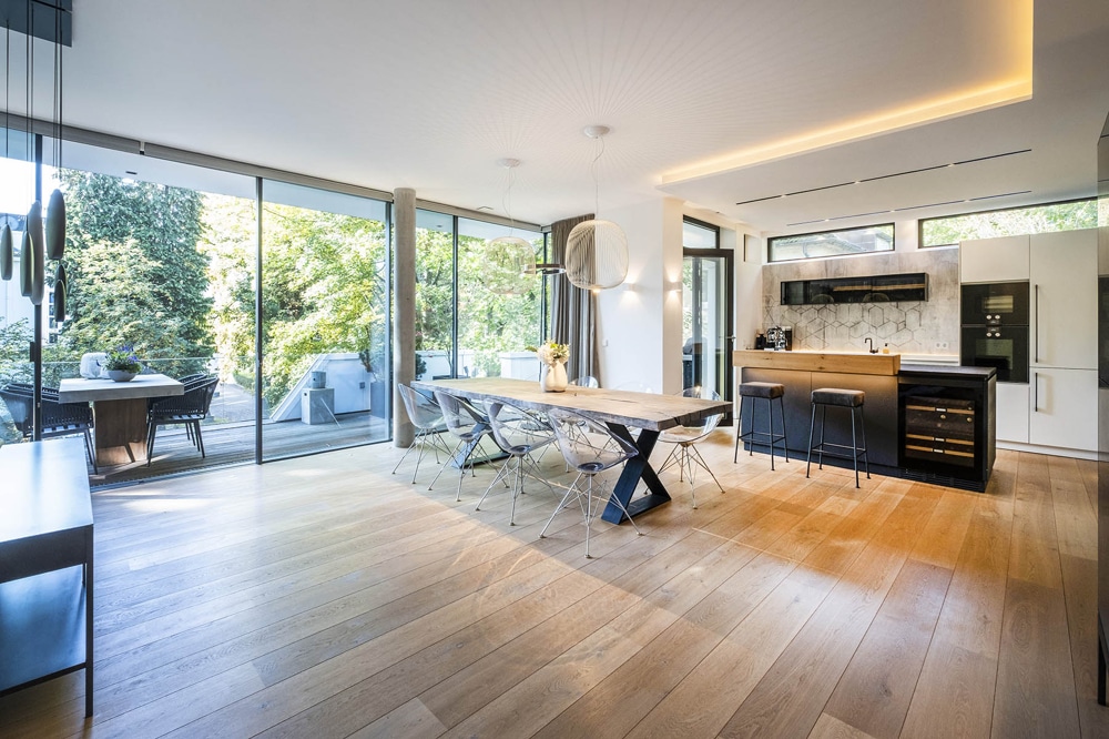Eleganz. Deckenhohe Panoramafenster schaffen beeindruckende Sichtachsen und lassen Innen- und Außenraum