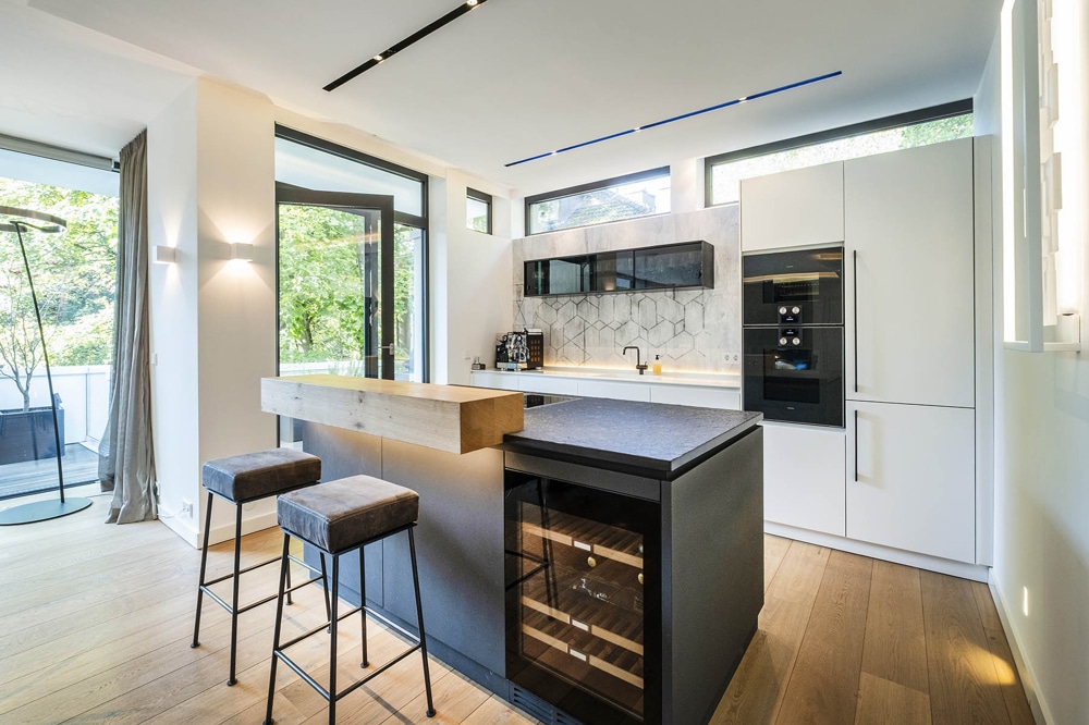 Möbeltischler angefertigte Unikat überzeugt durch höchste handwerkliche Qualität und fügt sich nahtlos in das innenarchitektonische Gesamtkonzept ein. Hochwertige Elektrogeräte namhafter Hersteller sowie ein integrierter Weintemperierschrank ergänzen die exklusive Ausstattung.